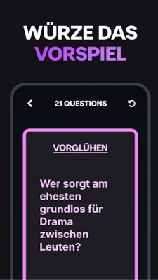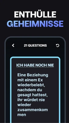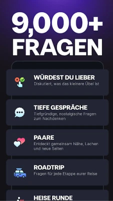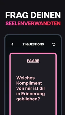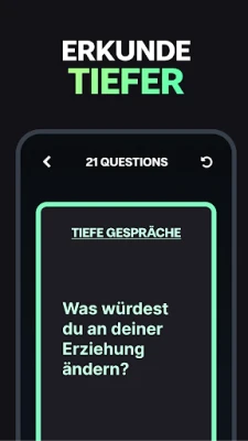 `21 Questions` ist mehr als nur eine Sammlung von Spielen; es ist ein Katalysator für unvergessliche Augenblicke und persönliche Entdeckungen. Verabschieden Sie sich von langweiligen Abenden und begrüßen Sie eine neue Dimension des Miteinanders, in der Neugier geweckt und Verständnis gefördert wird. Jedes Spiel ist eine Einladung, die Gedankenwelt des anderen zu erkunden, gemeinsame Werte zu erkennen und vielleicht sogar neue Seiten an sich selbst zu entdecken. Bereichern Sie Ihre Beziehungen, entfachen Sie Diskussionen und genießen Sie die Freude am gemeinsamen Entdecken mit `21 Questions`.