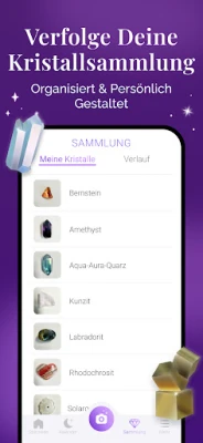Für eine noch intensivere Erfahrung bietet Crystalyze Premium erweiterte Funktionen. Personalisieren Sie Ihre Sammlung, indem Sie eigene Fotos Ihrer Kristalle und Steine hinzufügen und diese übersichtlich in Kategorien wie "Eigene Sammlung", "Favoriten" oder "Wunschliste" verwalten. Vertiefen Sie Ihr Wissen über essenzielle Aspekte wie Kristallpflege, die korrekte Reinigung und Aufladung, die Geheimnisse der Kristallnumerologie und wirksame Affirmationen. Crystalyze rüstet Sie mit allem aus, was Sie benötigen, um eine tiefere und bewusstere Verbindung zu Ihren Steinen aufzubauen. Tauchen Sie mit Crystalyze in ein Universum voller Weisheit ein, entdecken Sie die astrologischen Verbindungen und harmonisieren Sie Ihre Praxis mit den Rhythmen des Mondes für ein umfassend bereicherndes und heilendes Erlebnis.