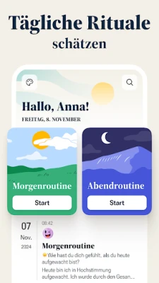 Im Herzen von Gratitude & Self-Care Journal finden Sie leistungsstarke Werkzeuge wie das Dankbarkeits- und Stimmungstagebuch. Tauchen Sie ein in tägliche Reflexionen, unterstützt durch anregende Impulse und Erinnerungen, die Ihnen helfen, Ihre neue Gewohnheit konsequent zu pflegen. Bereichern Sie Ihre Einträge mit Fotos, um Ihre Erinnerungen lebendig zu halten, und gestalten Sie Ihre ganz persönliche Morgen- und Abendroutine, um jeden Tag bewusst zu beginnen und ausklingen zu lassen. Ein integrierter Kalender gibt Ihnen dabei den Überblick über Ihre Fortschritte und ermöglicht es Ihnen, wichtige Momente und Selbstfürsorge-Termine mühelos zu planen und zu verfolgen.