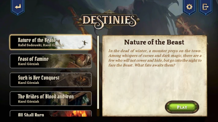 Beginne ein unvergleichliches Abenteuer mit *Destinies*, einem wegweisenden, kompetitiven Brettspiel, das tiefgehende Geschichten mit Erkundungsfreiheit verbindet. Um in diese immersive Welt einzutauchen, ist das physische *Destinies* Brettspiel unerlässlich. Nach dem Start der *Destinies* App wählen Sie Ihr bevorzugtes Szenario und werden sofort in eine fesselnde dunkle Fantasy-Erzählung gezogen, in der unzählige Schicksale auf ihre Erfüllung warten. Die App leitet Sie intuitiv durch den gesamten Spielaufbau – von der Verteilung der Charakterfähigkeiten und Startgegenstände bis hin zur präzisen Anordnung der Kartenfelder, die vor Ihnen liegen und nur darauf warten, entdeckt zu werden.