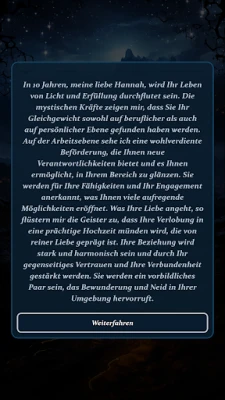 Entdecken Sie mit "Mystische Wahrsagung" die Geheimnisse Ihres Schicksals. Dieses persönliche Portal bietet individuelle Wahrsagung und verbindet Sie mit der spirituellen Welt. Erhalten Sie direkte Antworten auf Ihre Zukunftsfragen und finden Sie Klarheit über Ihr Leben und Ihren Weg.
