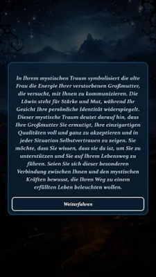 Darüber hinaus entschlüsselt "Mystische Wahrsagung" die geheimnisvolle Sprache Ihrer Träume. Oft sind nächtliche Visionen tiefgründige Übermittlungen aus dem Unsichtbaren. Die App ermöglicht Ihnen eine detaillierte Traumdeutung, die Ihnen hilft, die dahinterliegenden Botschaften und deren Bedeutung für Ihr Wachleben zu verstehen. Als ein hochentwickeltes digitales Medium schlägt sie eine Brücke zwischen Ihrer Welt und der mystischen Ebene. Sie übermittelt die Weisheit unsichtbarer Kräfte und geisterhafter Entitäten, um Ihre tiefsten Fragen zu beleuchten und Ihnen fundierte Ratschläge für die Herausforderungen des Alltags zu bieten.